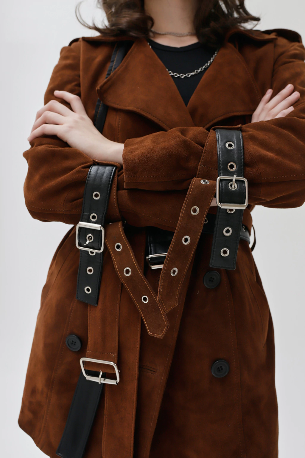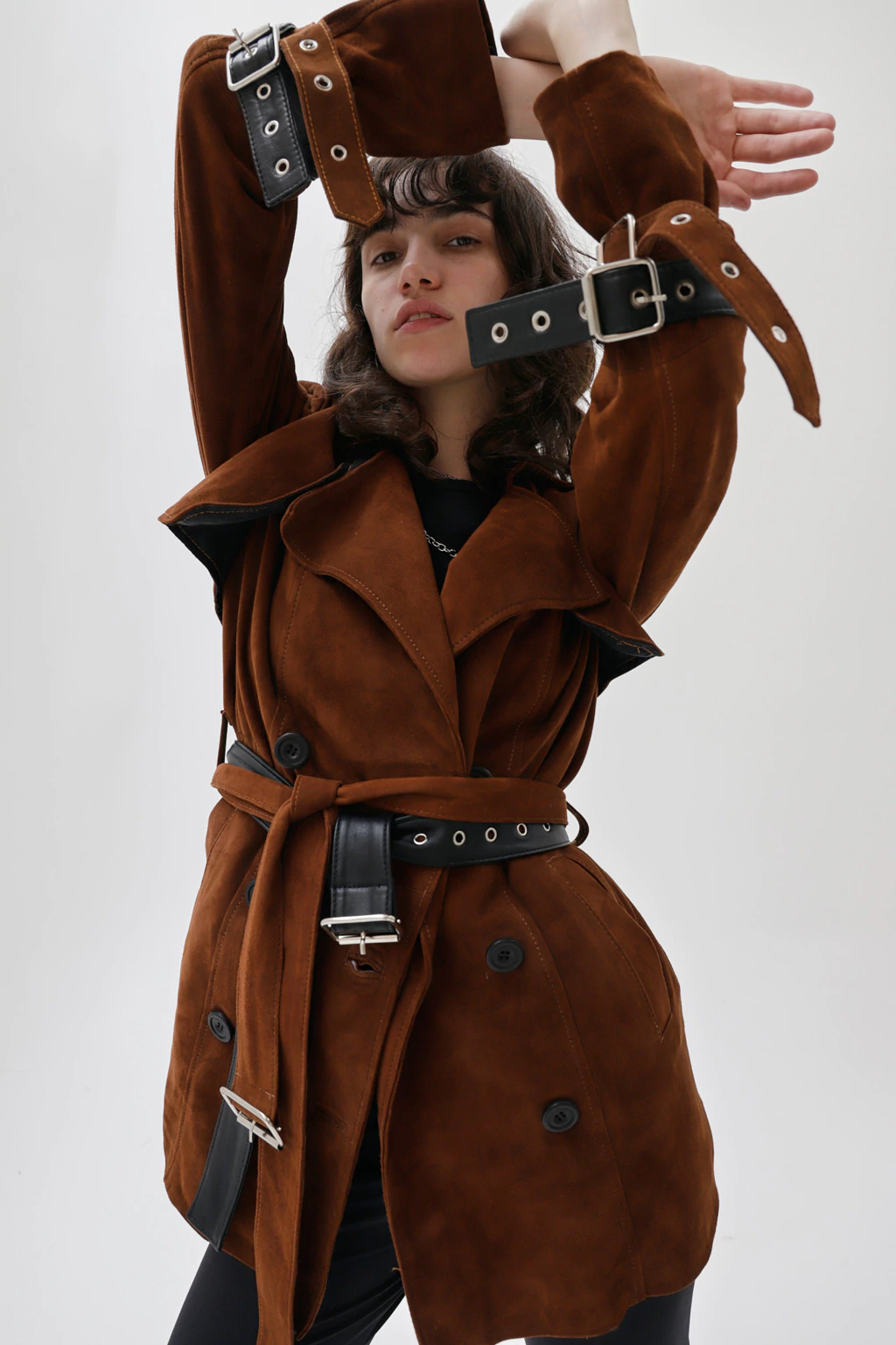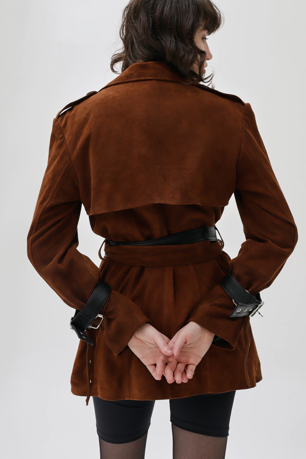 Cuero ovino italiano | Forrería interna | Cinturón de cierre | Detalle de cinturones desmontables en mangas